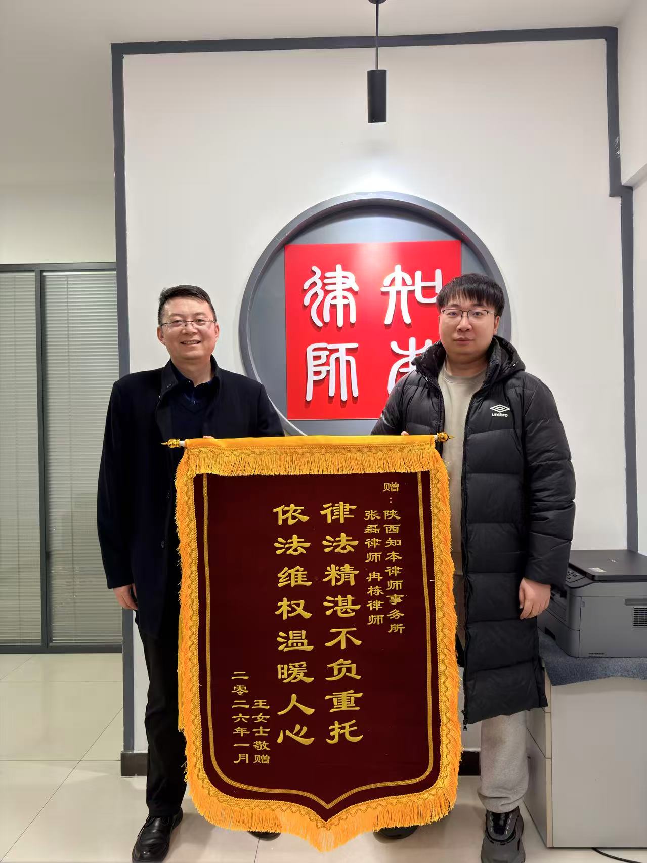 2026年1月27日下午,陕西知本律师事务所的办公室里,又添了一抹温暖的亮色——近日,当事人王女士专程送来一面印着“依法维权温暖人心,律法精湛不负重托”的锦旗,紧紧握住张磊、冉栋律师的手,连声道谢:“真的太感谢您了!如果不是您,我真不知道该怎么办……”